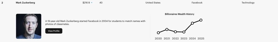 位居榜单第二位的是Meta平台的首席执行官马克·扎克伯格(Mark Zuckerberg),其个人资产高达2160亿美元,而令人瞩目的是,他目前仅40岁。